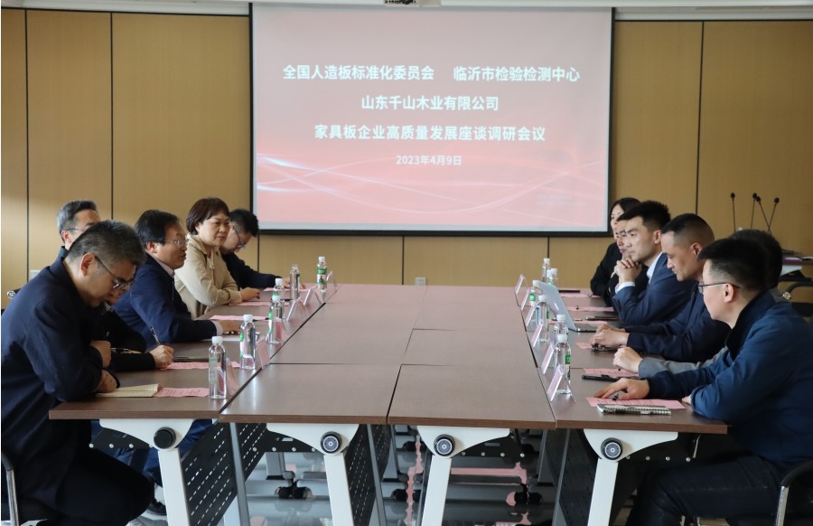 4月9日(ri)下午,全國人造板標(biao)準化技術(shu)委員(yuan)會副主任兼秘(mi)書長研究員(yuan)段新(xin)芳(fang),副秘(mi)書長李曉玲,臨沂市(shi)檢(jian)(jian)驗檢(jian)(jian)測(ce)中心黨(dang)組書記(ji)、主任劉愛友,黨(dang)組成(cheng)(cheng)員(yuan)、副主任黃波,市(shi)檢(jian)(jian)驗檢(jian)(jian)測(ce)中心質檢(jian)(jian)所(suo)所(suo)長竇興(xing)霞及相關專業技術(shu)人員(yuan)蒞臨千(qian)山木(mu)業進行(xing)調研。 領導一(yi)行(xing)先后參觀了千(qian)山新(xin)建自動化生態板生產車間、高標(biao)準成(cheng)(cheng)品庫、國內先進的浸漬(zi)膠膜紙飾