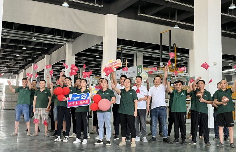 “祝千山25周年生日快樂”、“時尚潮派衣柜 就選千山板材”的嘹亮口號響徹活動現場,大家意氣風發,自信昂揚,展現了千山人新時代踔厲奮進、拼搏進取的精神。