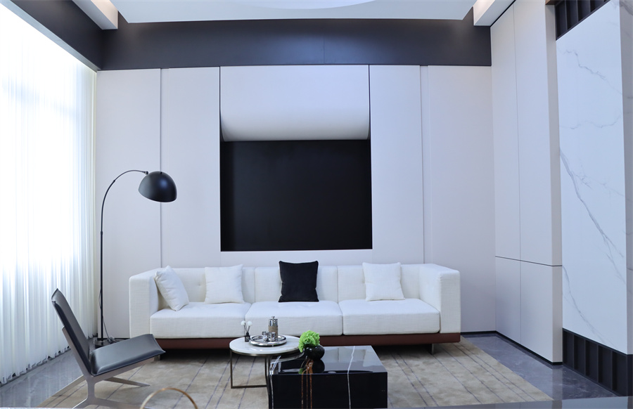 展廳五大空間呈現現代極簡、現代輕奢、新中式三大主流家裝風格,采用千山板材四大品類,糅合六大系列花色:木紋系列、純色系列、石紋系列、同步系列、數碼系列、PET系列,演繹多元化生活場景。