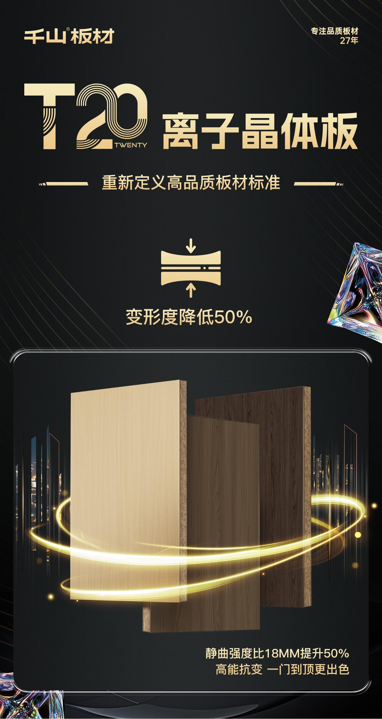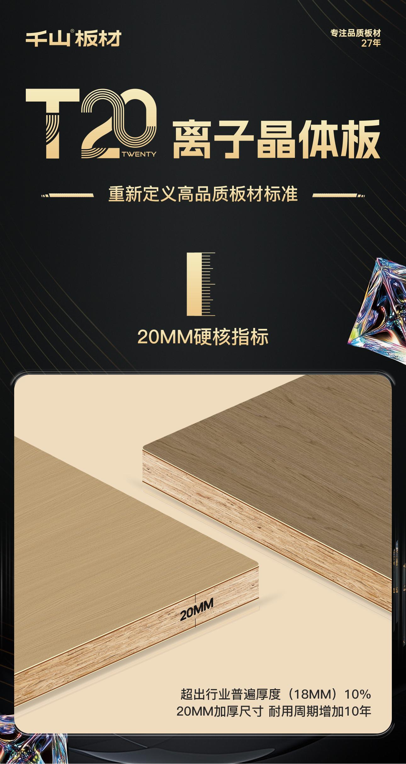 T20離(li)子晶(jing)體(ti)(ti)(ti)板(ban):是表(biao)面覆有離(li)子晶(jing)體(ti)(ti)(ti)層,板(ban)材(cai)(cai)承(cheng)重比常規18mm提(ti)升50%,變形度降低50%,耐磨性(xing)能提(ti)升3倍以上的20mm高(gao)端飾面板(ban)材(cai)(cai)。T20離(li)子晶(jing)體(ti)(ti)(ti)板(ban)是千(qian)山板(ban)材(cai)(cai)推出的高(gao)端飾面板(ban)材(cai)(cai),由千(qian)山集團(tuan)與南京林業大學(xue)材(cai)(cai)料科(ke)學(xue)與工程(cheng)學(xue)院聯合(he)研(yan)發(fa),于2025年4月18日在臨沂(yi)全屋定制展首(shou)次(ci)發(fa)布,定價(jia)1099元/㎡,旨在為消費(fei)